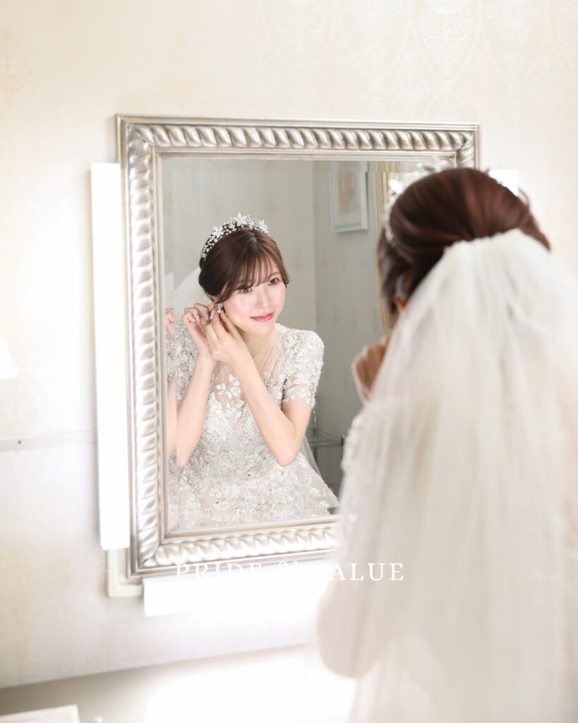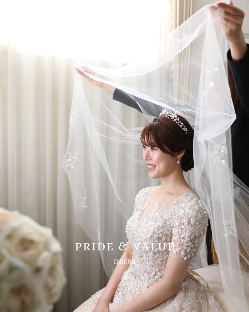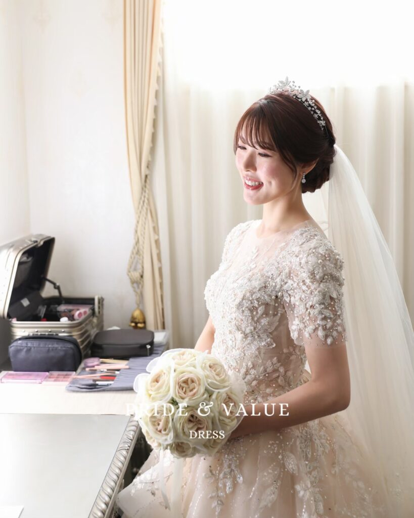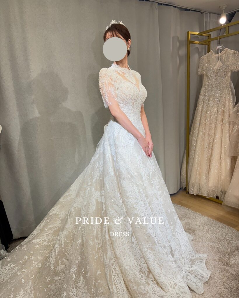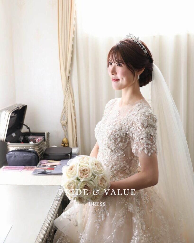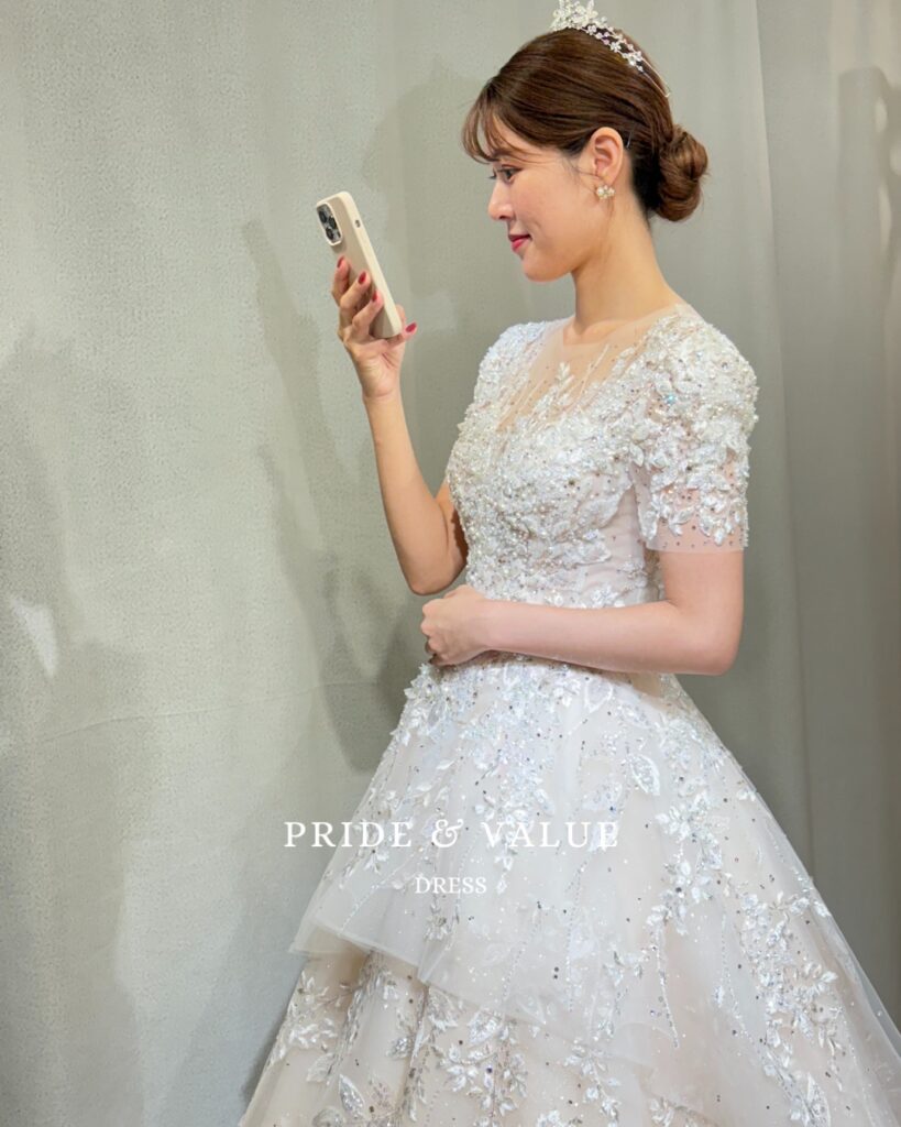 今回ご紹介するのは、愛知県から大阪のドレスショップ「Pride & Value Dres(プラバリュ)」へご来店くださった花嫁さま。ショップに一歩足を踏み入れた瞬間、「わあ…!」と目を輝かせながら感嘆の声を漏らされたその姿がとても印象的でした。サロン内に並ぶキラキラとしたドレスの数々に、心を奪われたご様子でした。もともと、全国各地のショップを巡りながら「韓国キラキラビジュードレス」をお探しだった新婦さま。