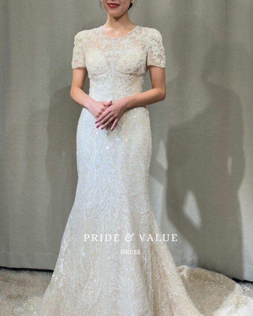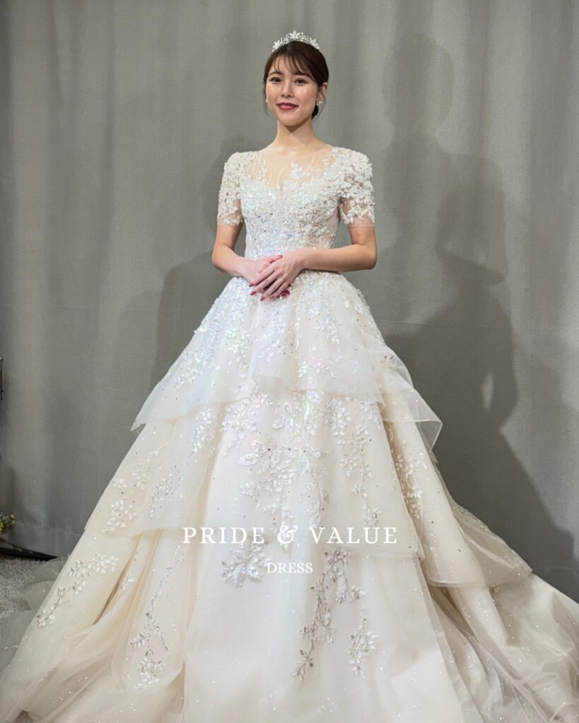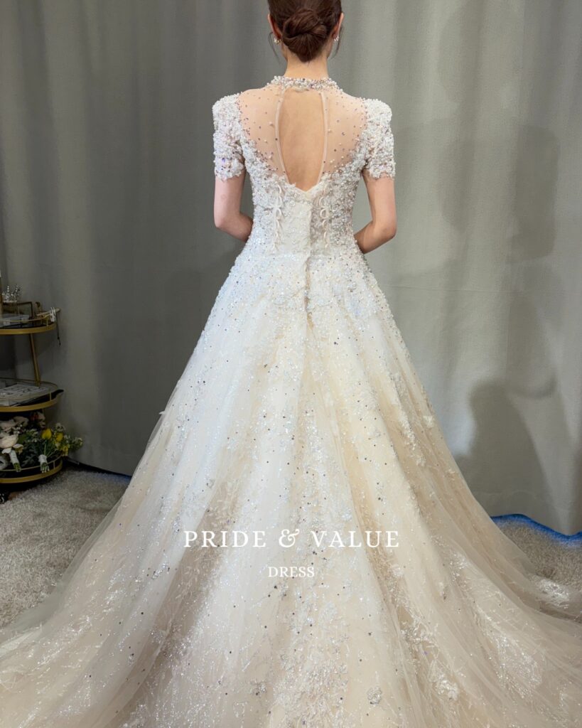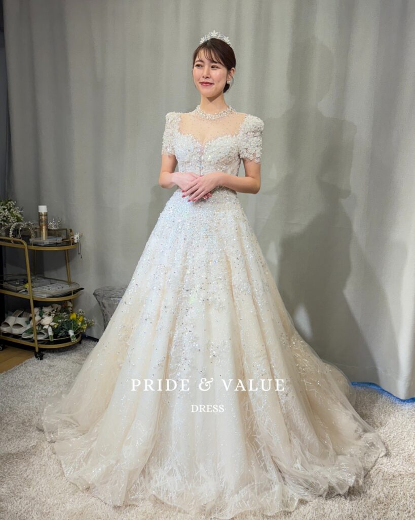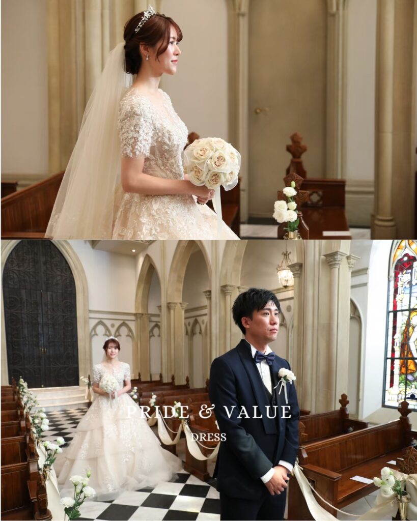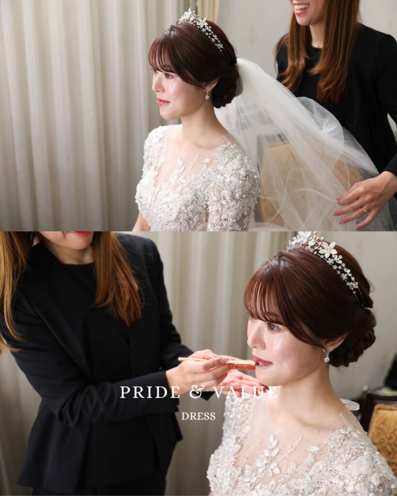 今回ご紹介するのは、愛知県から大阪のドレスショップ「Pride & Value Dres(プラバリュ)」へご来店くださった花嫁さま。ショップに一歩足を踏み入れた瞬間、「わあ…!」と目を輝かせながら感嘆の声を漏らされたその姿がとても印象的でした。サロン内に並ぶキラキラとしたドレスの数々に、心を奪われたご様子でした。もともと、全国各地のショップを巡りながら「韓国キラキラビジュードレス」をお探しだった新婦さま。