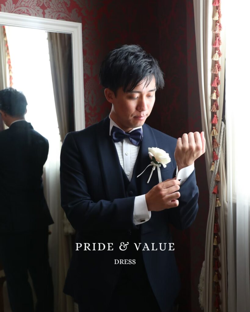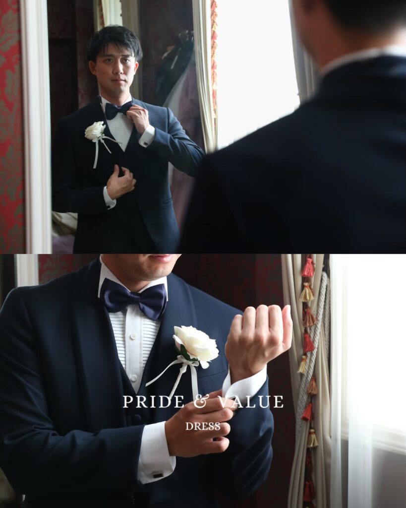 新郎様のタキシードは、今季の新作ネイビータキシードをセレクト。