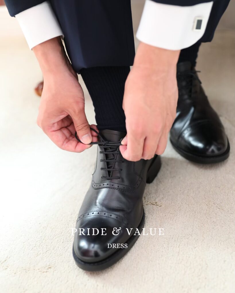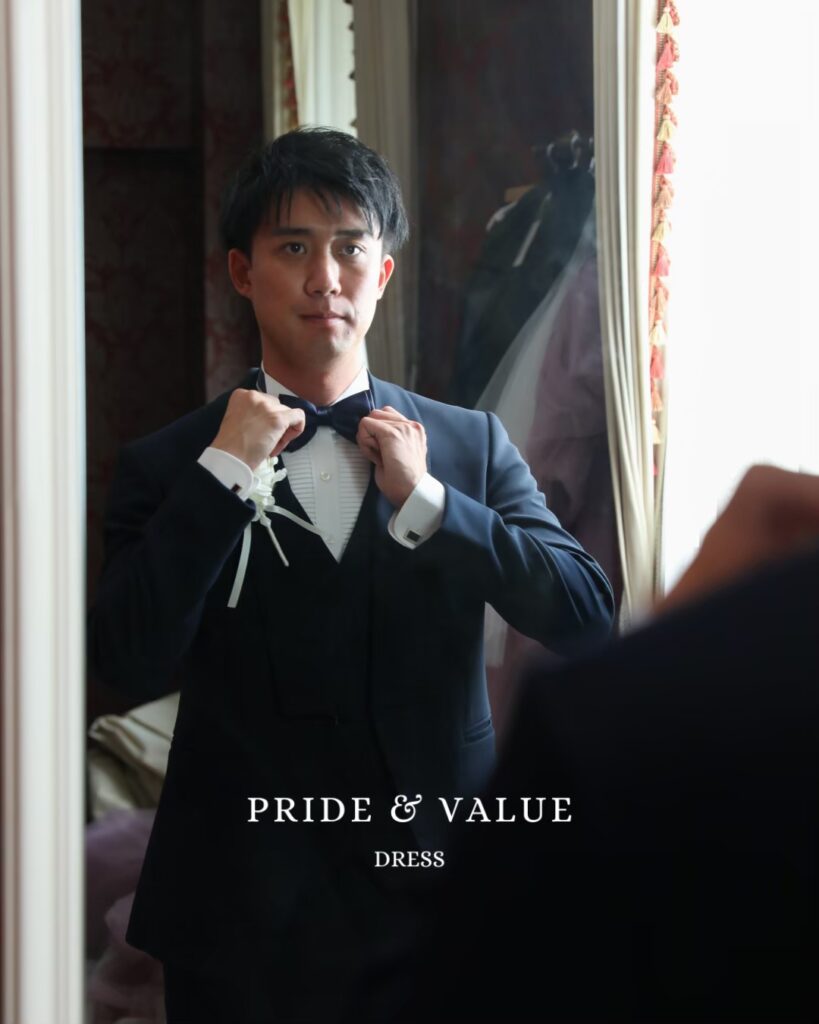 小物合わせでは新郎様もご来店され、タキシードを試着された際には、シークレットシューズの自然なスタイルアップ効果に感動されていました。「これはすごい…!」と笑顔を見せてくださったのが印象的です。